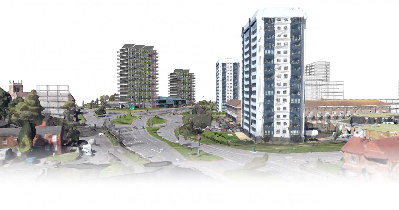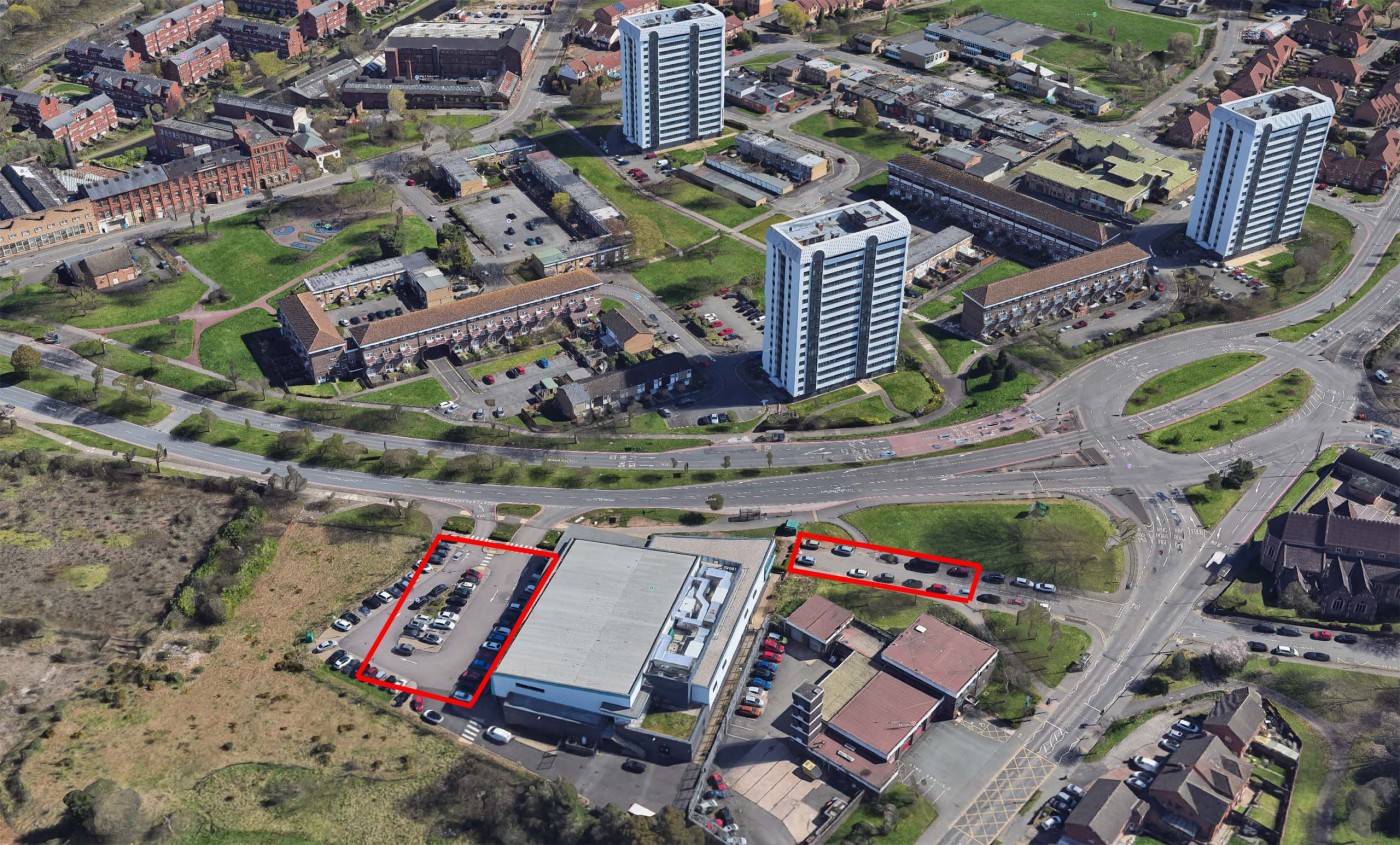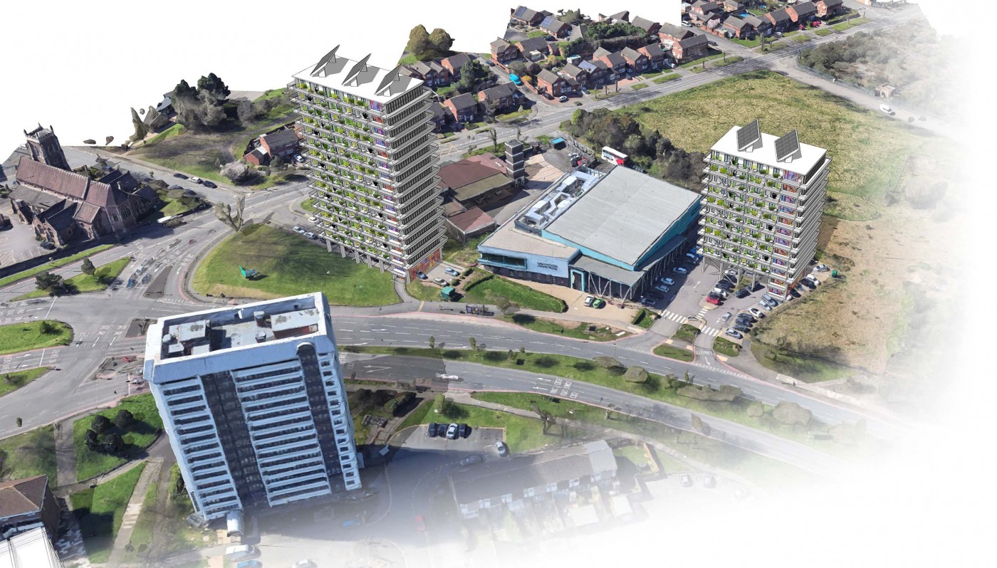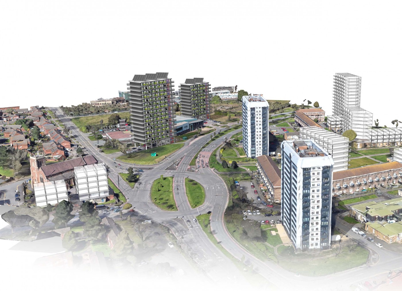 Ladywood Circus defines the southwest corner of Ladywood, this major junction on the Middleway has lots of redundant ex-highways land where new homes can be built, in this case owned by the council, along with the airspace over the leisure centre car park. Here we're showing a tall block on a section of the closed off Monument Road with a shorter sister block above the Leisure Centre car-park framing the centre itself. The design of the 125 TopHuis homes ensures there is no loss of the existing parking spaces.