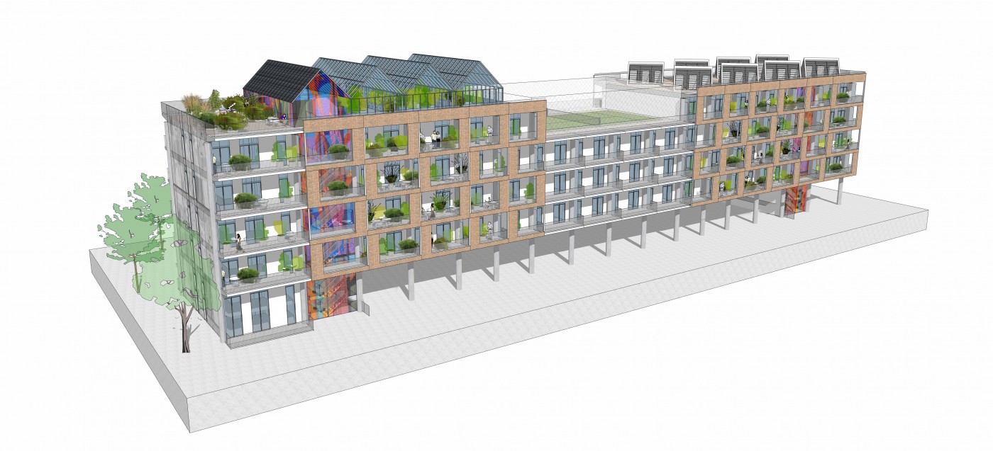 The sociable deck access gives space to grow plants, improve biodiversity and allow people to get to know their neighbours whilst also protecting the building from extreme sun and rain. There are always two separate escape routes in an emergency. We've shown rooftop greenhouses in case the project proceeds with a community group to maintain these spaces, subject to detailed user requirements.